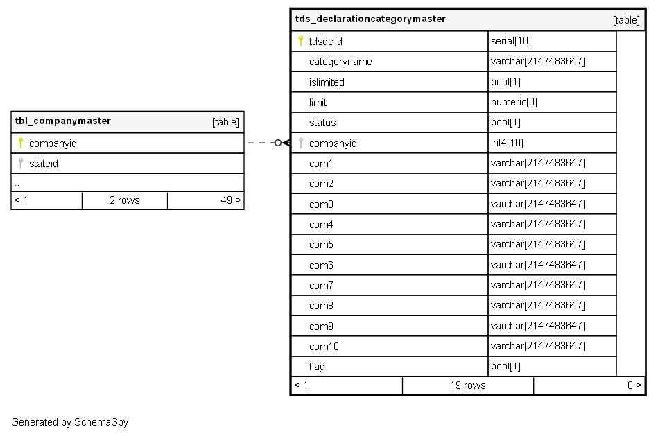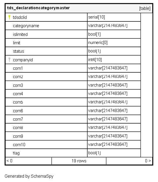 | tdsdclid | serial | 10 | √ | nextval('tds_declarationcategorymaster_tdsdclid_seq'::regclass) |